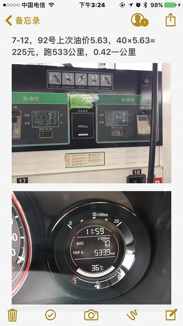 按92#6.47/L, 95#7.01/L, 40L油跑的路程对比,92便宜95能走更远,算下来两种油每公里的费用几乎是一样的。