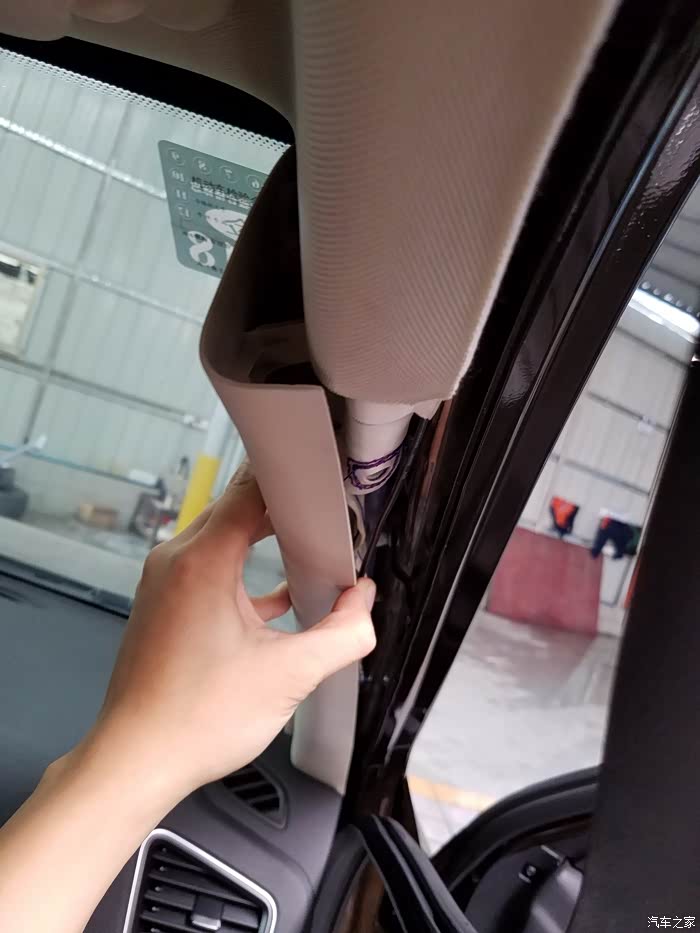 然后掰开A柱内侧的塑料外壳,1.3T顶配能看到安全气囊有一部分卷缩在A柱里