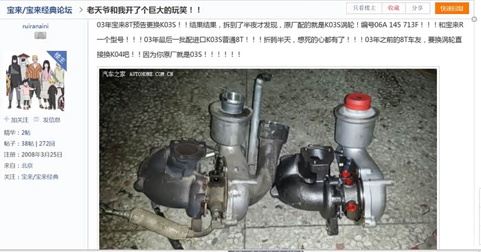 1.首先看看,很久以前就有坛友发的帖子。说他车本来用的就是K03s。型号是06A145713F。
