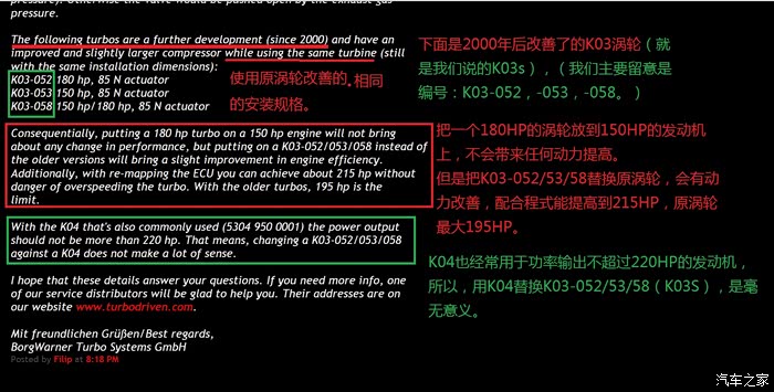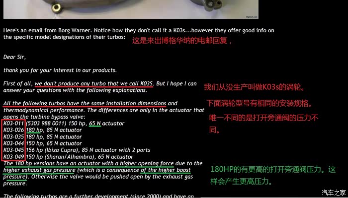 10。来出网上,博格华纳的电邮回复。注意看了,上面的改善版K03-052/53/58。