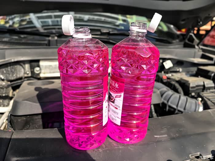两瓶玻璃水,我觉得差不多可以满了。