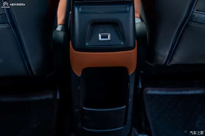 后排扶手箱没有出风口,但是有一个USB接口照顾后排乘客的用电需求。隐藏式的杯架非常好。