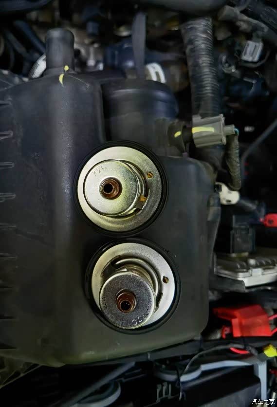 拆除五颗螺丝后就可以将整个节温器组件拆下来了,也可以看到里面需要更换的两个节温阀了(节温阀安装时请注意密封圈上面有个突出点,安装时凸点对准凹点就可以了,忘记拍照片)