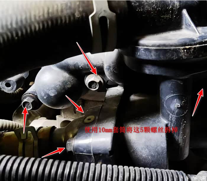 第三步使用10mm套筒扳手拆除节温器上面的5颗螺丝,如下图