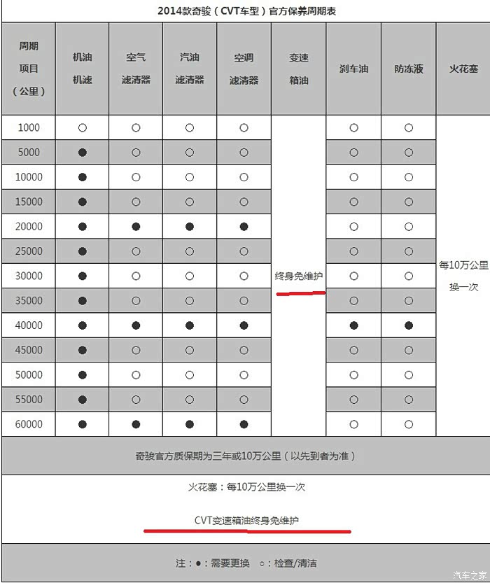 哥也是较真的主,立马参看汽车之家----奇骏保养周期,确实!明明白白写有---- 终身免维护!无语了~~
