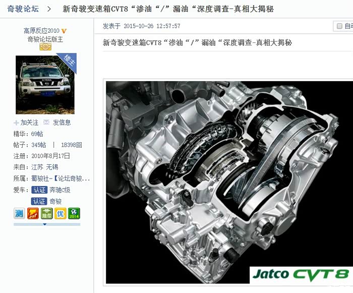 奇骏实际使用情况如何?为了避免某些人说三道四,先引用几张 逍客版主:枫桥帖子里的照片 (逍客和奇骏其cvt变速箱均是jatco同一型号)