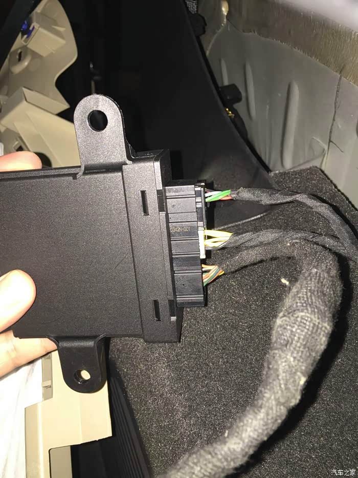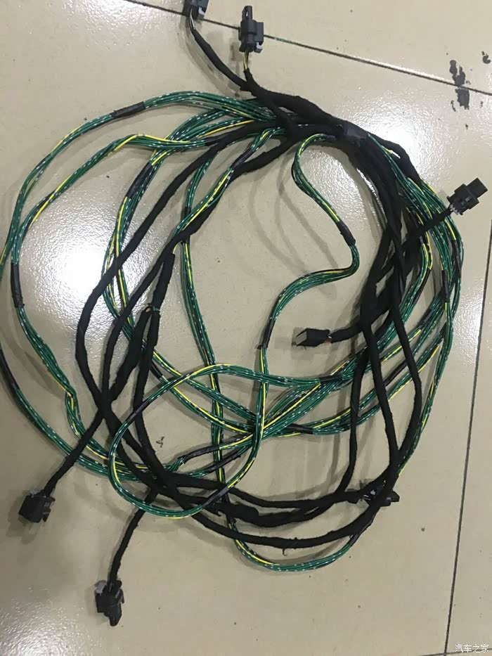 看到带有绿色线的黑色插头了吗?这个就是需要跳线的原车电脑数据接头,和豪华版车是不同的,中间白色的是后雷达的数据接头,最后面的最长的就是前雷达数据接头。