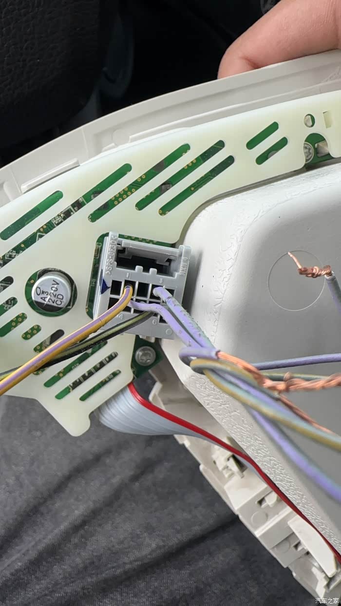 线从这里出来就可以进机舱了,那个圆形橡胶堵中间挖个洞把线穿出来,沿着旁边走到前保险杠位置