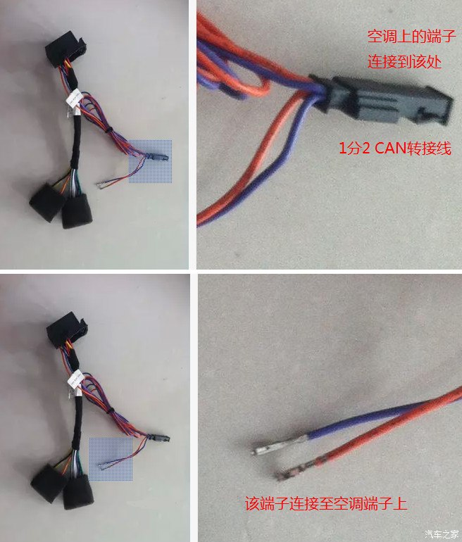 5.4 拆卸空调面板线束,使用速腾1.6转为转接线(CAN总线1分2线)连接空调端子上,不用破坏整车线束;