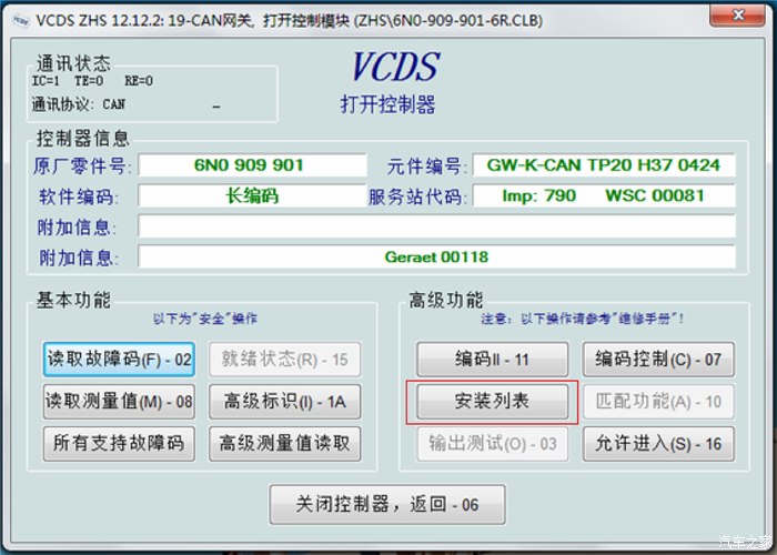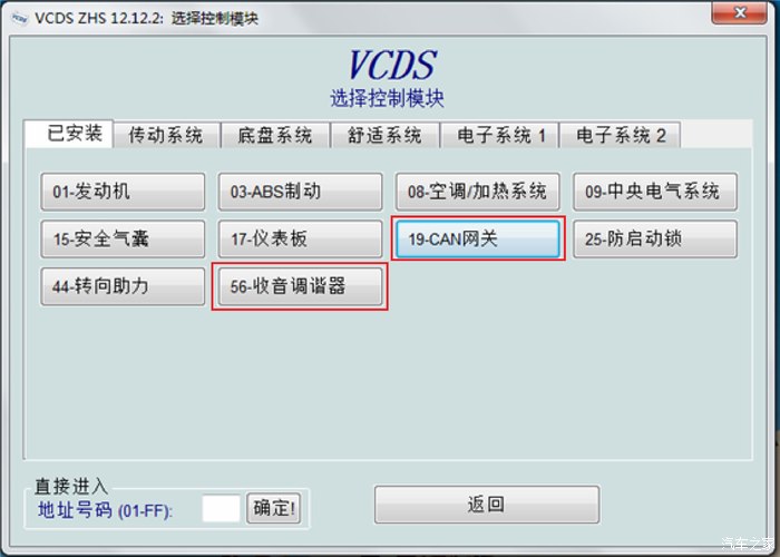 7.3 打开5050选择模块(可以看到“已安装”列表中多了“56-收音机调谐器”),点击“19-CAN网关”进入网关