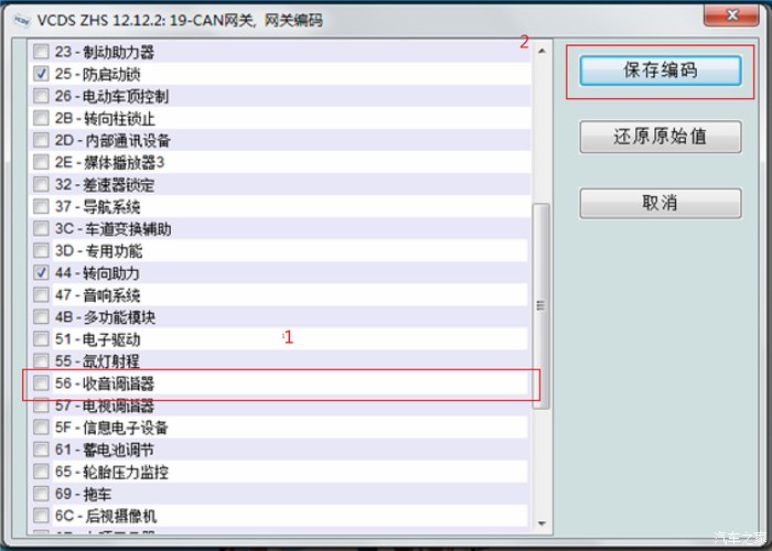 7.5 如下图,步骤1勾选“56-收音调谐器”,步骤2“保存编码”