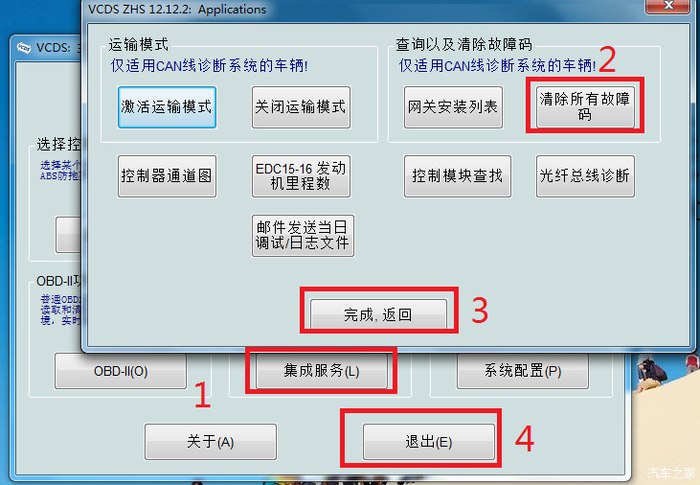 7.6 退出网关设置,回到设置界面,如步骤1选择“集成服务(L)”,步骤2“清楚所有故障码”,步骤3“完成,返回”,步骤4“退出(4)”