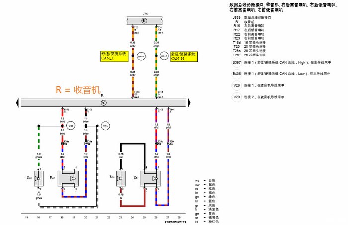 R 表示收音机 (请留意电路图中,每一车门上都是配置2个喇叭的)