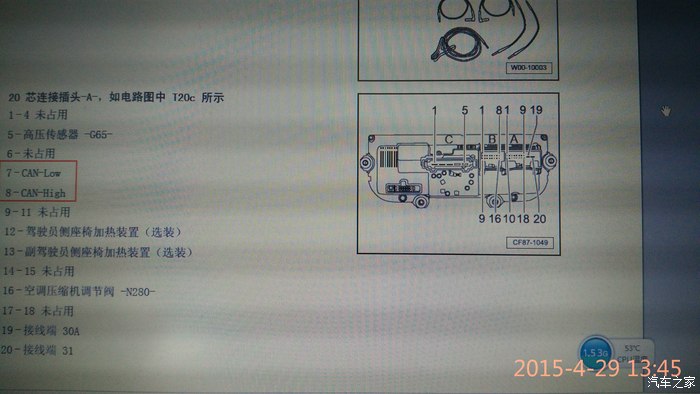 以上从图纸分析,RCD510支持连接“舒适/便捷系统CAN”,并可就近连接至空调接线端子上;同时向X宝网钻石级卖家求证(承诺确保改装成功,完美匹配整车网络,否则全额退款),于是怀揣着对于技术的执着,内心的忐忑,进行了改装工作(事实证明,经过多方信息论证,深入分析,敢想敢做,离成功就不远了);
