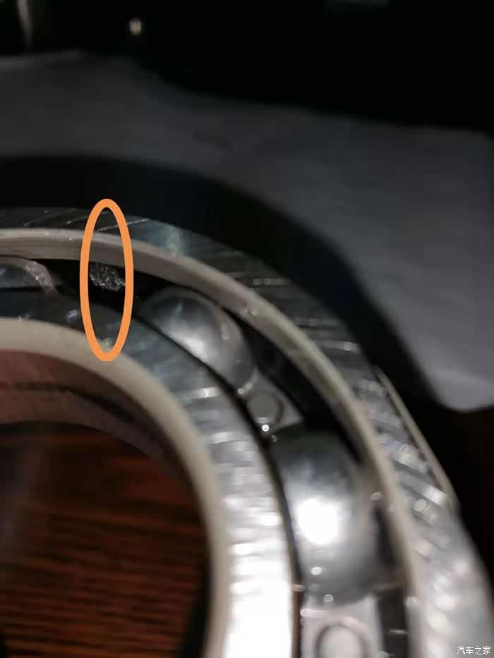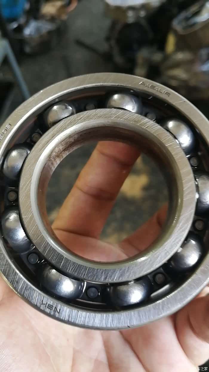 用手转一下,有明显震动,仔细观察,发现内部有金属脱落形成的麻坑。师傅说,原因要么是油里有杂质,要么是轴承材质缺陷。看到右边的凹槽了吗,对加工精度有要求的。