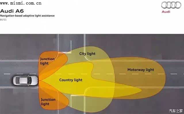 雨雾模式(又称:全天候模式):45度侧向辅助照明,启动雨雾模式时大灯会适时压低照射高度,降低光线散射减少眩目,同时点亮辅助照明,一是弥补因大灯照射高度降低对横向照射范围的影响,二是增加更大横向照射范围,进一步减少眩光,起到更好照明效果。