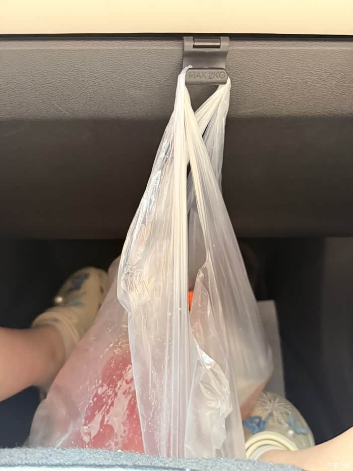 第一处 “隐藏挂钩” 藏在副驾驶的收纳箱里。打开收纳箱后,在内部中间位置就能看到一个小巧却结实的挂钩,虽然标注承重 2KG,但实际使用中即便挂稍重的物品也稳稳当当,毕竟吉利的品控实力向来经得起考验。逛超市买的肉菜、带汤汁的熟食,甚至是折叠伞、手提包,都能稳稳挂在这里,既不会占用座位空间,又能避免物品倾倒。?