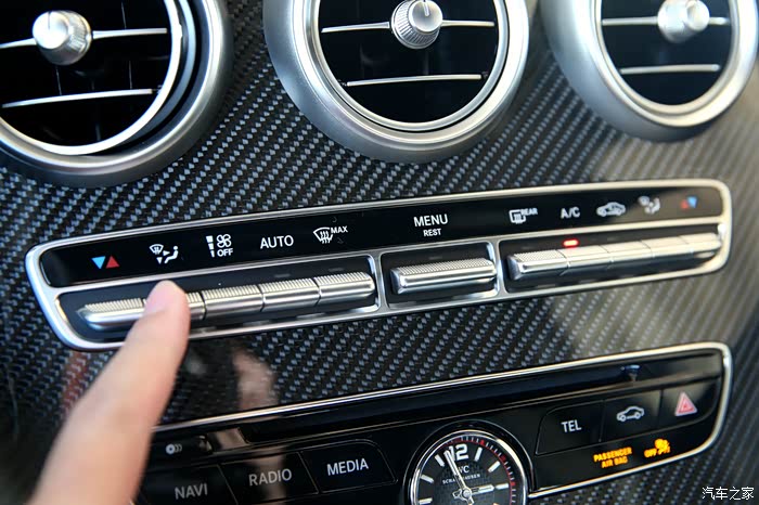先不说最上面这块“ipad”突不突兀,三出风的设计还是很不错的,出风口下面那排控制按钮也是全铝的,还不错。但是系统子菜单选项的按钮,就一般般了。先不说是不是塑料按钮的问题,我觉得是按钮设计太轻薄了,导致有些微的松动感,然后钢琴烤漆的按钮,再配上松动感,不太好的回弹感觉,我第一时间想到的就是国产车。。。真的。。。这就是我前面一直在说的,其实奔驰可以做得更好。