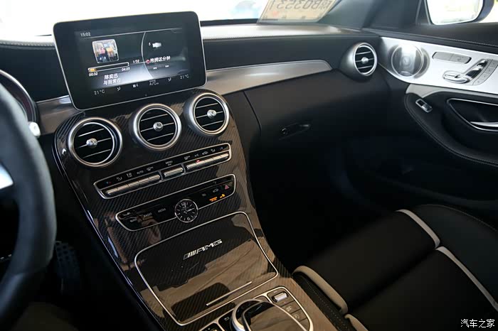 说了这么多,终于进来车里了。。。中控全景。我们也可以看到C63S-model也用了环抱式设计,中控的末端做了弧形处理再“连接”到车门,很好看。不过副驾驶那边的拉丝铝饰板的造型我觉得略显小气了些。当然,谁都没有办法把目光中中间那一大块碳纤维饰板上移开。。。(土豪味是不是浓了点。。。)
