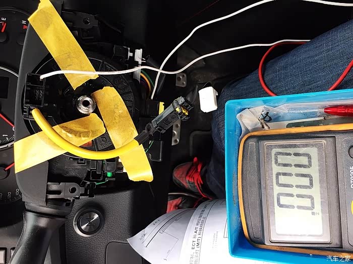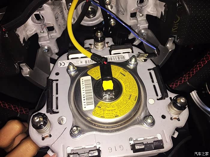拆下方向盘,游丝暴露出来。用美纹纸固定好游丝,不要让游丝转动(这点很重要!)。所有拆方向盘的人就怕两个事,一是气囊爆炸或之后的安全问题、二是游丝断裂。一般的游丝可以转动的圈数是5圈,我们方向盘回正的时候游丝在2.5圈的位置,这样方向盘可以向左右方向各转动两圈半;如果在方向盘拆除后不小心让游丝转动了一圈而你又不知道的时候,在接下来的转动方向盘的过程中就会直接把游丝扯断报废。