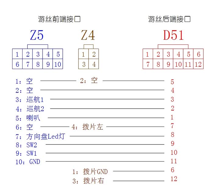 Z4及Z5接口为游丝前端接口,Z4负责换挡拨片,Z5原车负责喇叭、定速巡航。