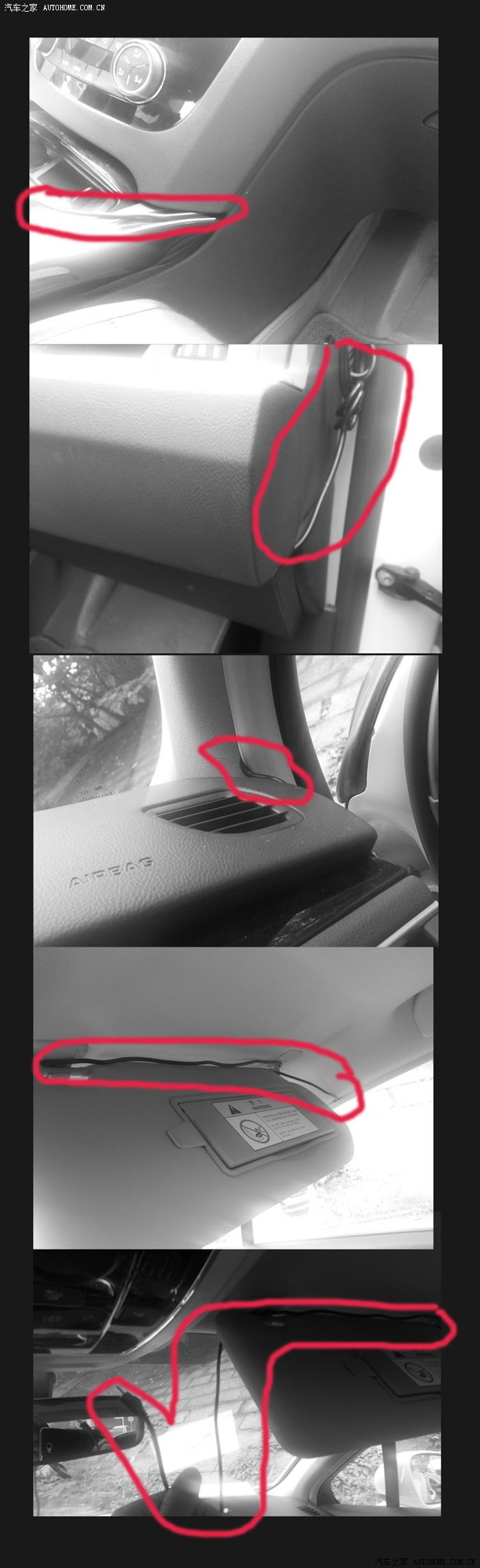 装记录仪,就想利用点烟器电源,不想从顶灯那里改动电线,要拆开顶灯,麻烦不安全。便自己尝试走线。反正结果能够让人接受,几乎看不到明线。顺便做了此贴分享,红线所框即所走的线路,应该很清楚了。