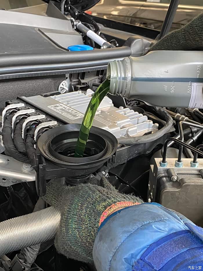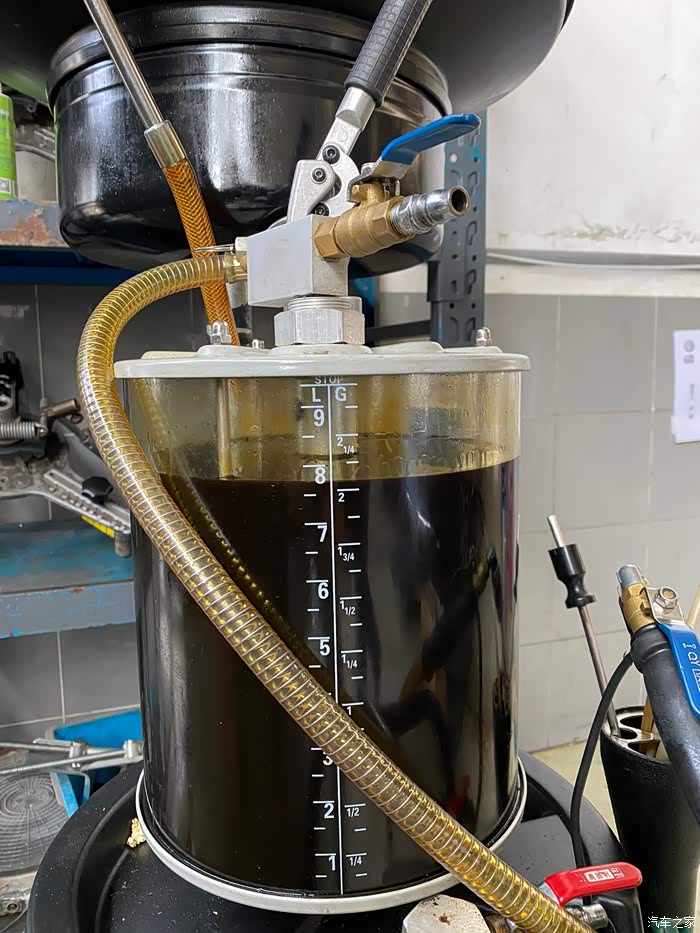 7瓶机油加完以后,机油表在最低线上一格。于是把最后1瓶也索性加完,总共8升机油,正好达到电子机油表上限。