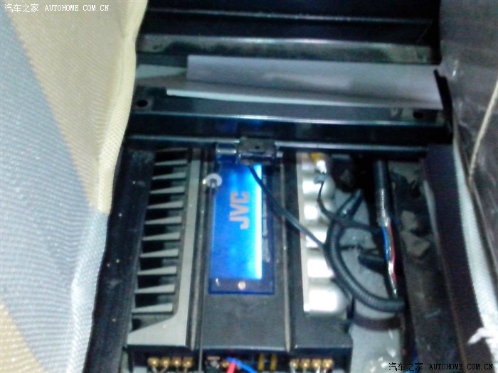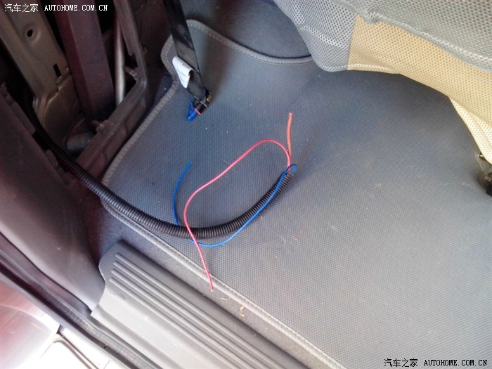 介绍一下,这个位置是中排座椅(改装过程见前帖),蓝色粗线为副电瓶火线,加了80A保险(以后还要加个控制继电器,现在天气要冷了,工期比较紧);4跟音频线在地毡下穿过,到各自的位置,白胶布标识;黑色套管中的为预留的电源线,通到后门边,准备加一个点烟器座,方便以后厨具及照明取电。