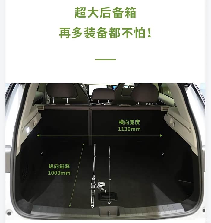 超大后备箱,再多装备都不怕!出门钓鱼,装备可少不了零跑C11超级增程不用放倒第二排座椅靠背情况下后备箱横向和纵向宽度也分别达1130mm和1000mm,后备箱容量375,放倒后排座椅即可拥有840L超大空间轻松变身“豪华大床房”