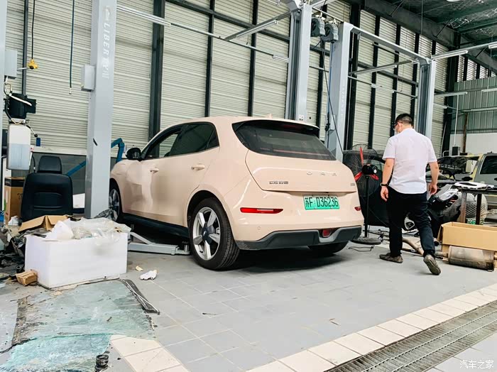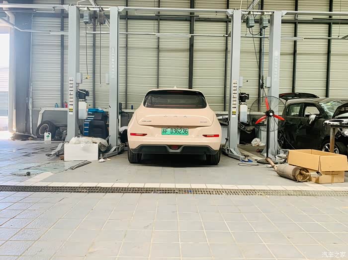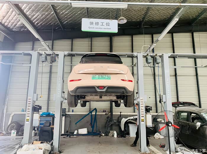 紧接着,准备工作都完成之后,就把好猫抬高了起来,售后的工作人员只是就底盘的电池、底盘的一些零部件检查了一下,也是在下面环视了一周,我原本以为会进行一些比较复杂的工作,实质上,他们也就是基本的看一下,电车的底盘构造,就肉眼看上去,真的很简单。所以,他们看了一周,也没有进行什么其他操作,这一点,确实比汽油车看起来方便好多。