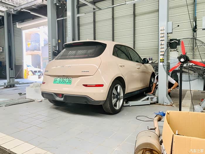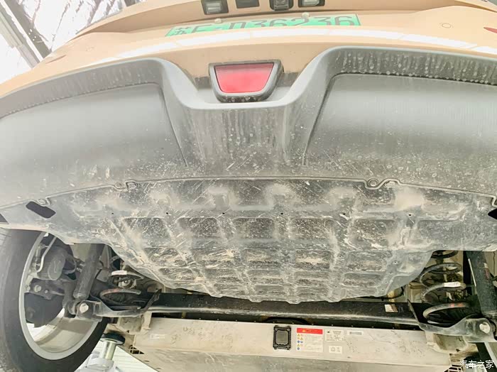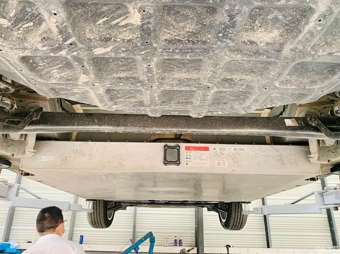 好猫被抬起来后,我是非常好奇的,因为平时的开车环境也算是相对复杂的,乡下的石子路,城市中心修建地铁、高架,路况不是太乐观,正好借此保养的机会,想了解一下仅两个月的用车之后,底盘状况是否还是良好的。接下来,带大家一起看看好猫的底盘到底长什么样。上面一张,是好猫的屁股底部,是一块类似塑料的厚板子,上面没有什么划痕,目前来看,是比较良好的,除了有些脏。