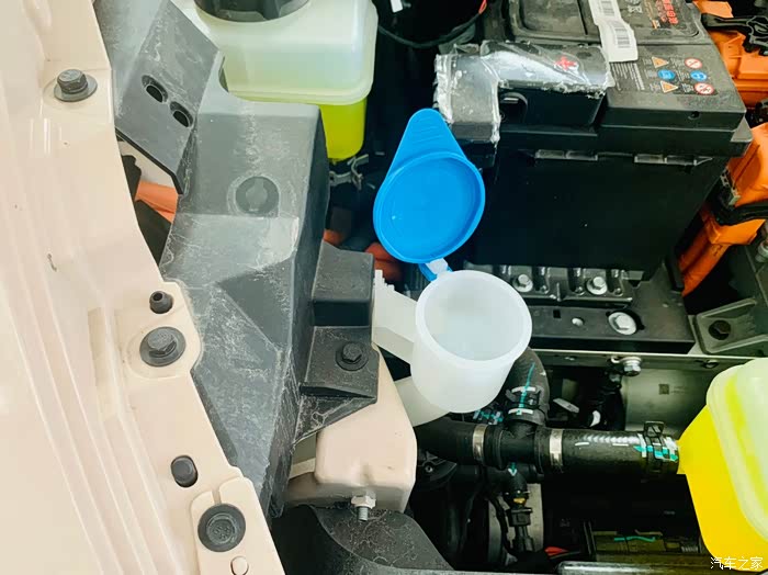 这蓝色的盖子,才是装玻璃水的装置,往里一直倒,想要倒满的话,也要倒掉常规的玻璃水大半瓶以上,容量还是蛮大的,工作人员也强调了一下,尽量不要加洗衣液之类的,会伤车子。