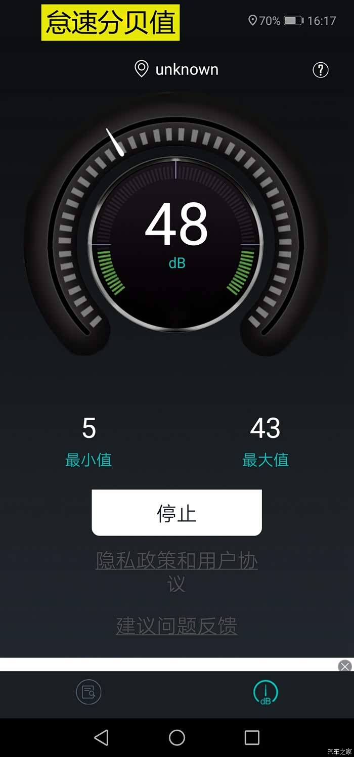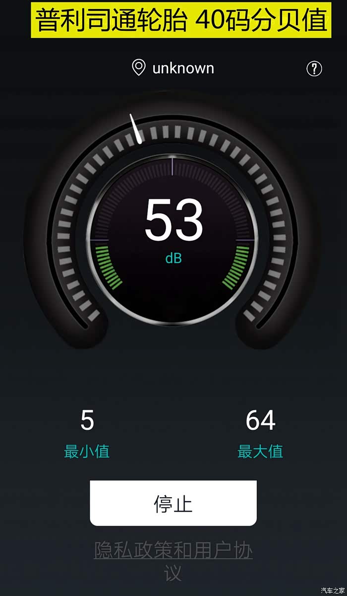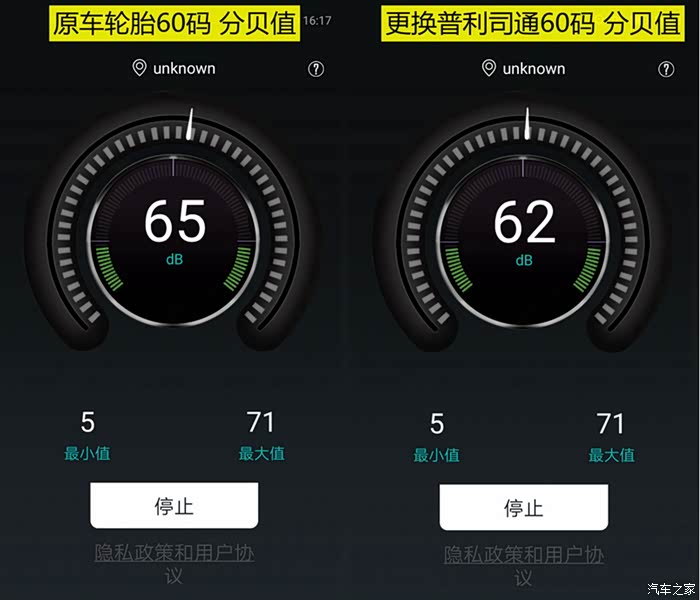 原车和换了普利司通轮胎后的 60码分贝值 对比, 分贝值降低了 3DB