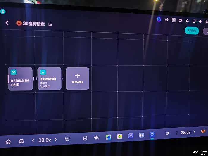 大家有没有注意蓝山的座椅按摩每次好像只能按30分钟左右,如果要重新打开的话又太麻烦,这时候我们就可以用上面的这个功能,当车速超过30km/h的时候,会自动打开座椅按摩。