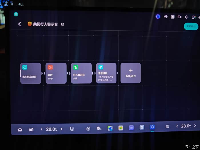 首先就是上面这个闭行人警示音的功能,我们开车的时候在低速的警示音总是比较烦,或者当我们想悄悄的离开不被别人的发现的时候就要关闭行人警示音。如果正常关闭则需要在车辆控制界面里面一个一个的按。这个技能制造局后,我们直接挂d档就可以关闭行人警示音。(后面那个语音提示不想要的的可以删除)