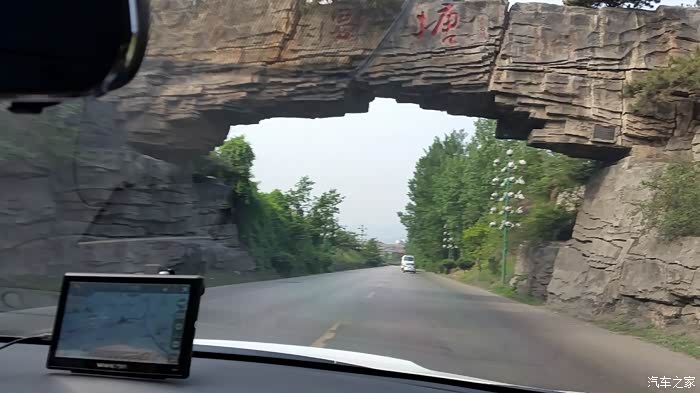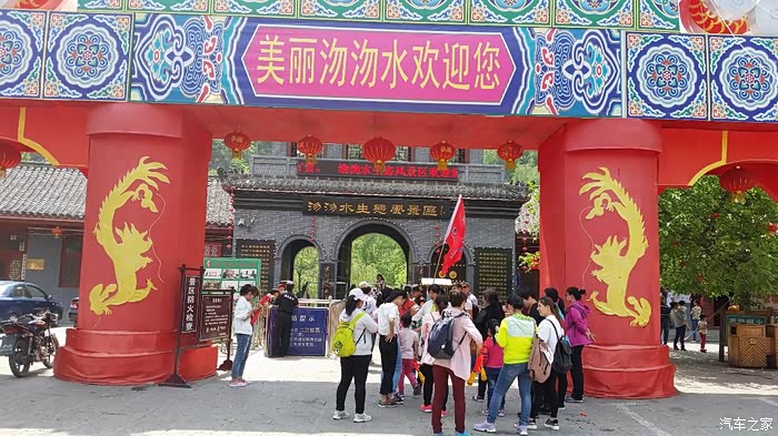 出了“温塘”收费站,沿着当前道路一直走下去,拐一个弯就看见了温塘的标志“温塘石拱门”。门上写着“温塘”二个红漆大字。