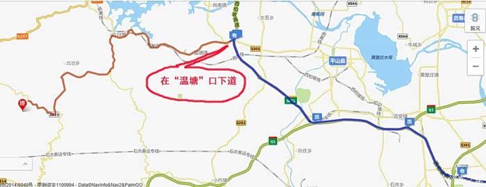 沿着西柏坡高速一直走,路上有提示,注意在“温塘”口下道。“温塘”下道的匝道口前100m左右有个“平山、温塘”匝道口,这里注意要直行通过,再往前走 150m左右穿过桥,就看见“温塘”匝道口,靠右走拐进“温塘”匝道。