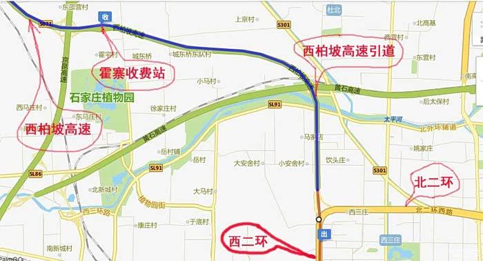 从石家庄市区出发最好在西二环与北二环的拐弯处上西柏坡高速引道,然后经“霍寨”收费站进入西柏坡高速。