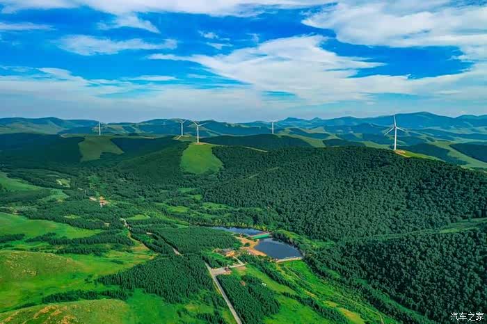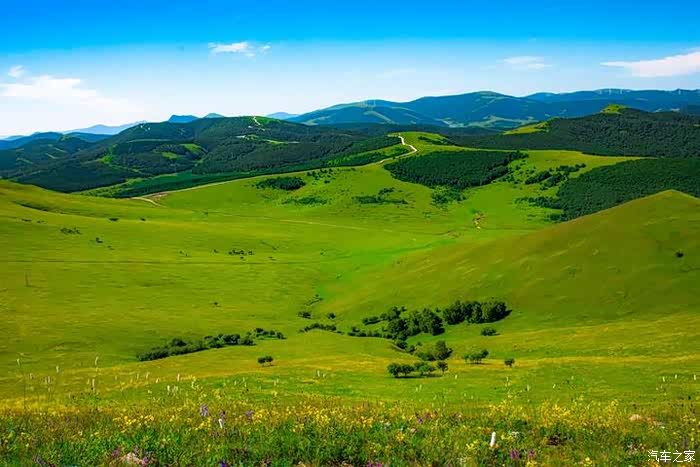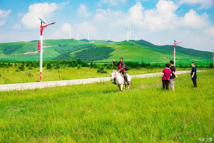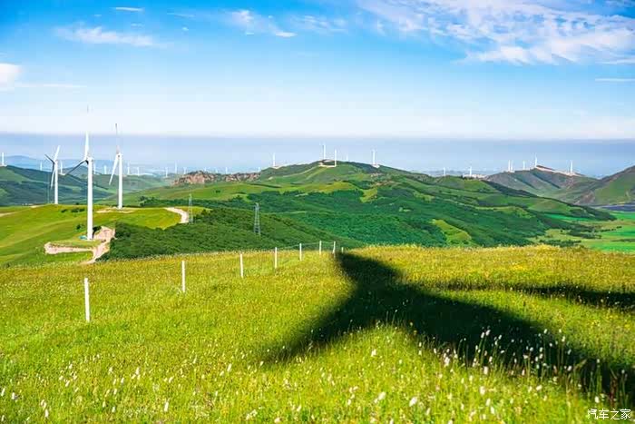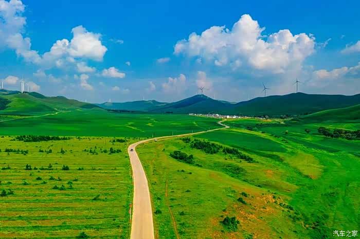 到达景区大门之前,入口有一条长长的水泥路,如果来时你没有被瞌睡所打败,就一定能看到 草原天路 独有的美妙。天高地阔,草甸、树林、山坡以及旋转的发电风车,组成了一幅完整绝美的草原画册,每走一段路都有不同的景色,让你忍不住停下车来,融入了旖旎秀美的一页又一页。