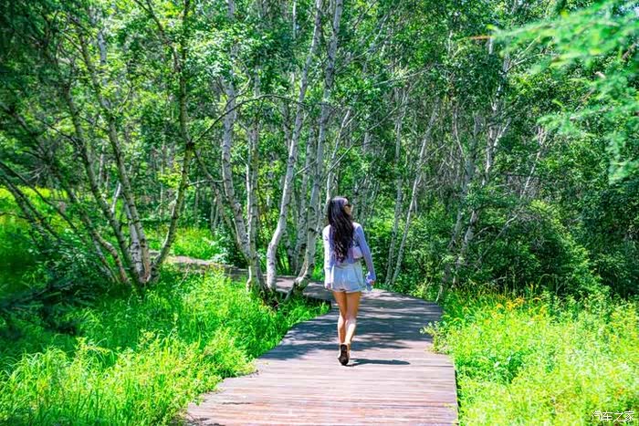 夏天的七彩森林,白桦树都挺直了腰杆,无孔不入的阳光也只能偶尔穿过繁茂的树冠,在栈道上留下光影婆娑。