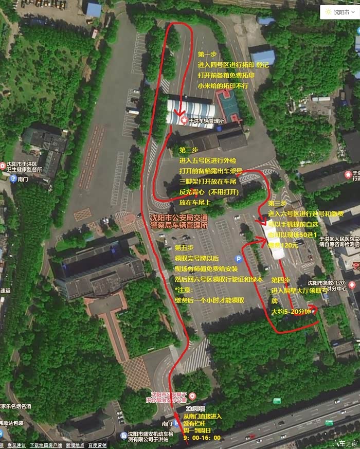 关于上牌,店里的上牌费用完全不用给,我记得大概是395,其实上牌的人没什么用就是领你走,有时候还会乱指挥耽误时间,自己去上牌20分钟,120元全部搞定,我甚至用卫星地图做了一个流程图给沈阳的车友们上牌流程图,去于洪的市车管所上牌当天就能取牌,人也不多。