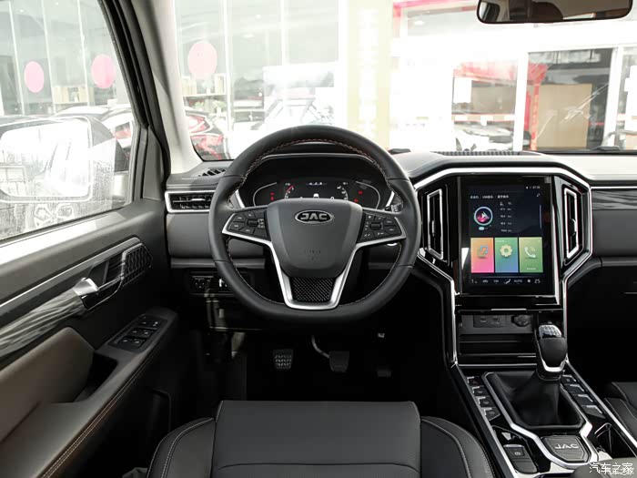江淮悍途车型采用乘用车内饰设计,“T”型设计的中控台采用软搪塑材质,看起来非常的高级。此外车辆标配有多功能三幅式方向盘、7英寸全液晶仪表盘、无钥匙进入、一键启动、10.4英寸多媒体大屏以及自动大灯、空调等。