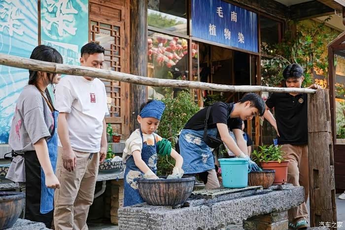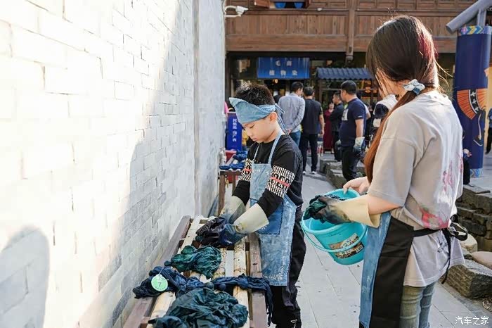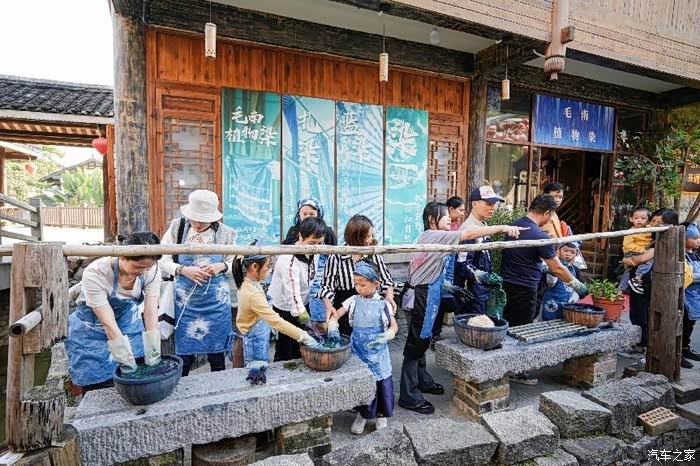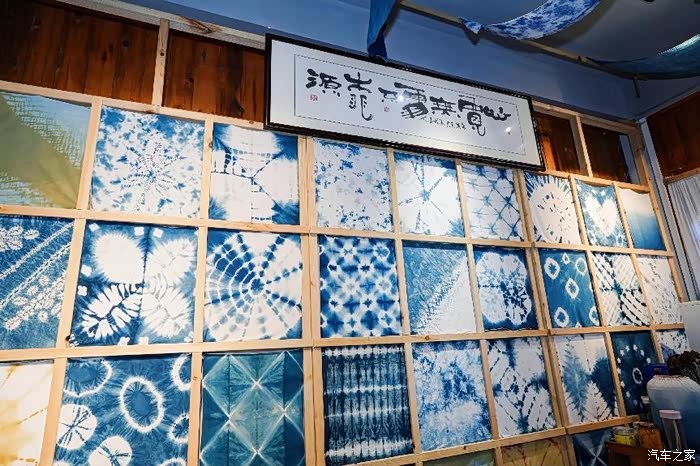 这里最有名的就是扎染啦,扎染是一种非遗传承,将一块白布用绳子扎好后,放入蓝色的染料中,待制作完成后,便可获得一片独特而纯净的蓝与白。这是民族技艺与大自然色彩碰撞出的瑰宝,也是近在身旁、可自己动手参与的文创艺术。