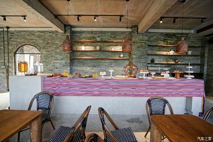 青色的砖墙,原木质感的桌子,很田园风的感觉。