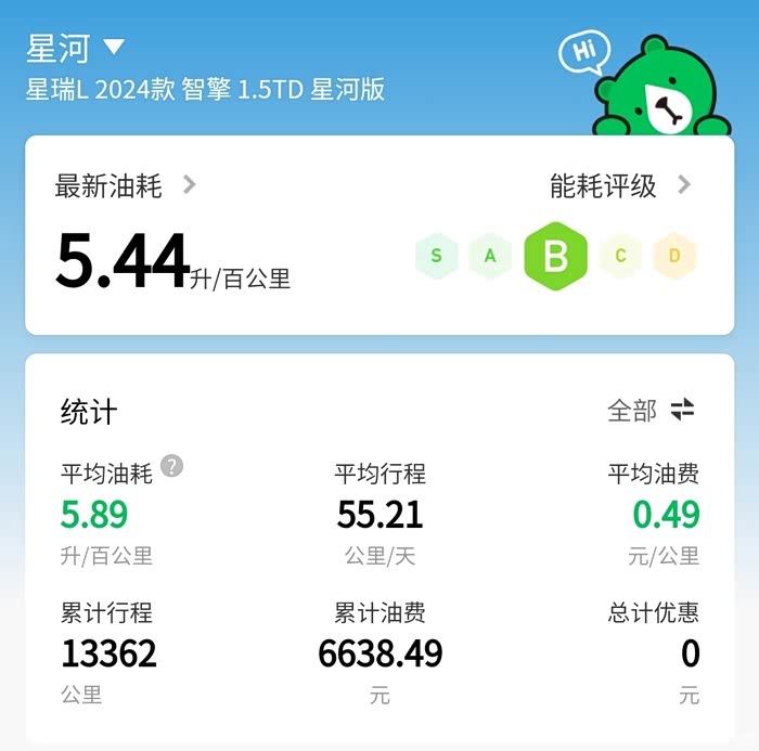 这个车在我手上开了13752公里,差不多有三分之二是高速,全程本人驾驶!本人在高速上基本是按照表县125开,超车比较多,胎压一般是冷车2.4左右,模式一般开舒适模式或者智能模式。长期加95号汽油,根据小熊油耗记录,目前合计加油6640元,平均约5.89升每百公里,约0.49元每公里。(我加95是因为公司能报销,按照车辆要求加92即可)。