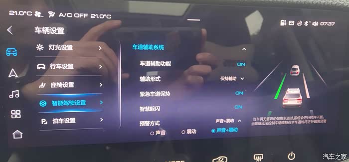 车道保持功能开启之后,仪表盘中间就会模拟出当前车道边线和大狗在车道中的行驶位置,大狗“无意识”的靠近车道边线时,车机系统会根据当前设置给出对应反馈,如:声音警告,方向盘震动警告,或是声音+震动双重警告;