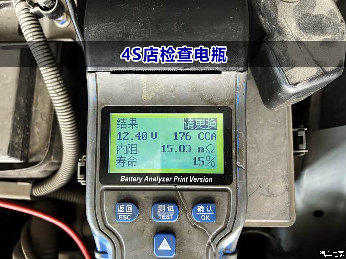 经测电压12.4V、CCA176、内阻15.83mΩ、寿命15%,确定电瓶挂了。