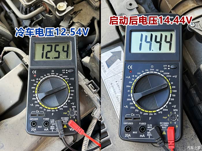 电瓶充满后冷车电压12.54V,启动后14.44V,发电机工作正常。