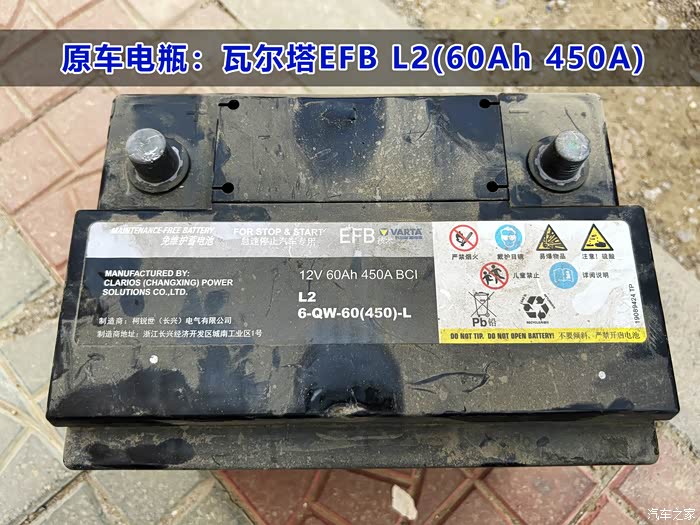 原车电瓶型号:瓦尔塔EFB L2 6-QW-60(450)-L(12V 60Ah 450A)。