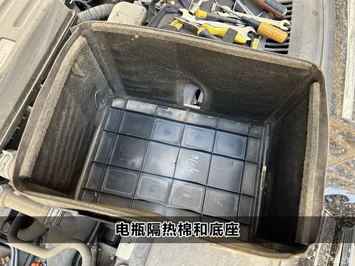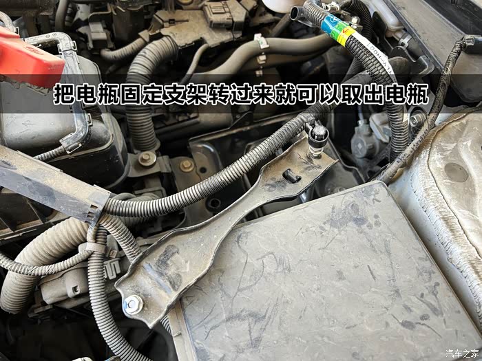 把电瓶固定支架转过来就可以取出电瓶,原车电瓶是没有提手的,需要双手用力提出来。